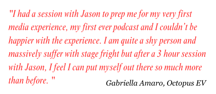“I spent three hours with Jason last week to better prepare me for an upcoming major podcast I am about to be featured on.It was one of the most insightful, valuable, interactive, and above all enjoyable training sessions that I have ever undertaken.For anyone who is involved in the interview, podcasting, radio, or blogging space and is looking to improve their skill set - I can’t recommend Jason enough. I learnt techniques that will benefit me at work, but also outside of the office in my everyday life too.”— Sam Steele, Octopus Electric Vehicles